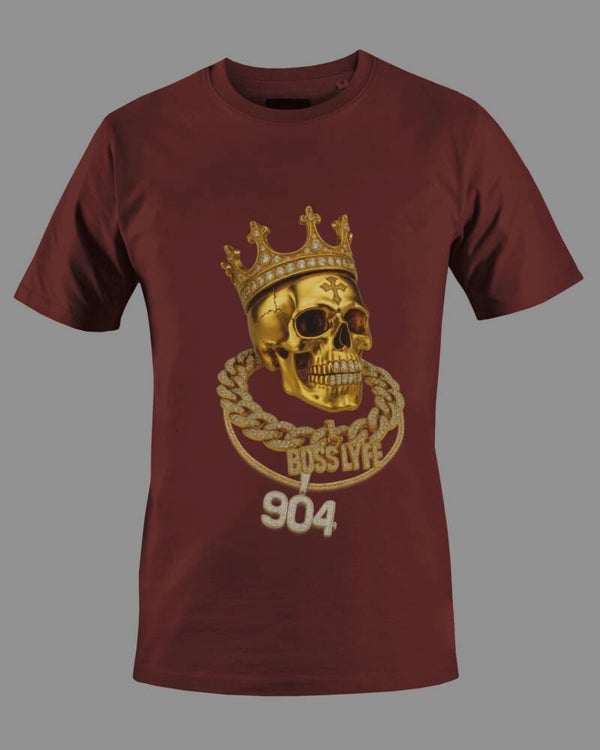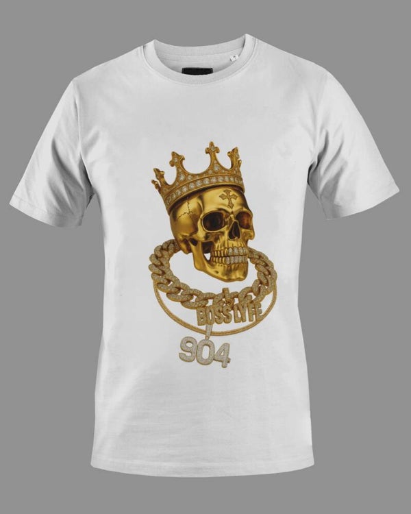 Royalty meets the hustle. The Boss Lyfe Skull Tee features a gold skull with a diamond-encrusted crown and iced-out chains stamped with “Boss Lyfe” and “904.” This bold, high-drip design is a salute to street royalty and Southern roots. Front print only, available in any shirt color.