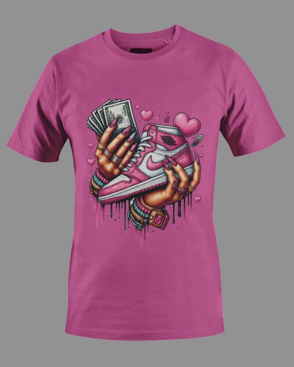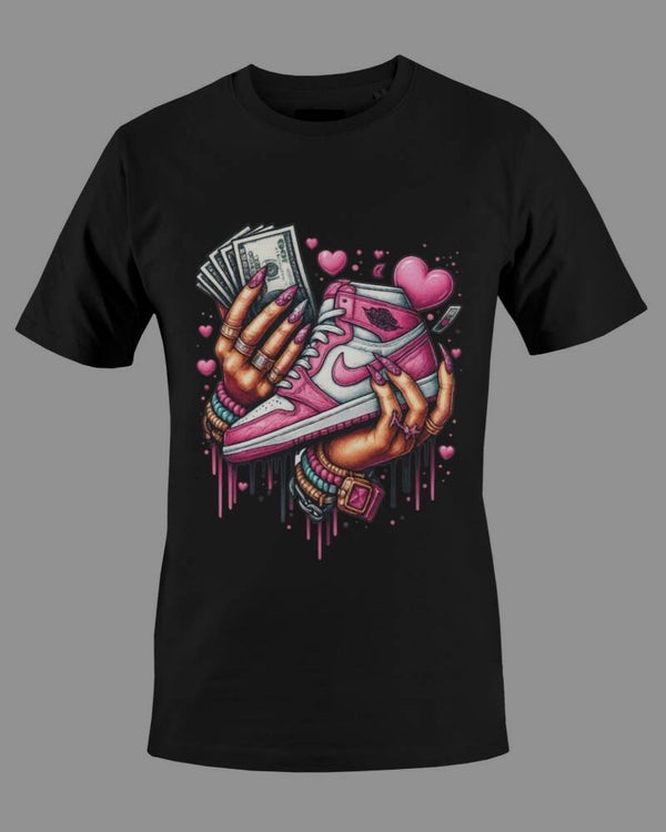 For the sneakerhead with a soft side and a strong hustle. The Laced in Love & Stacks Tee features bold artwork of manicured hands gripping a pink sneaker and a fistful of cash—dripping in color, hearts, and street-style vibes. Available in any shirt color, front print only.